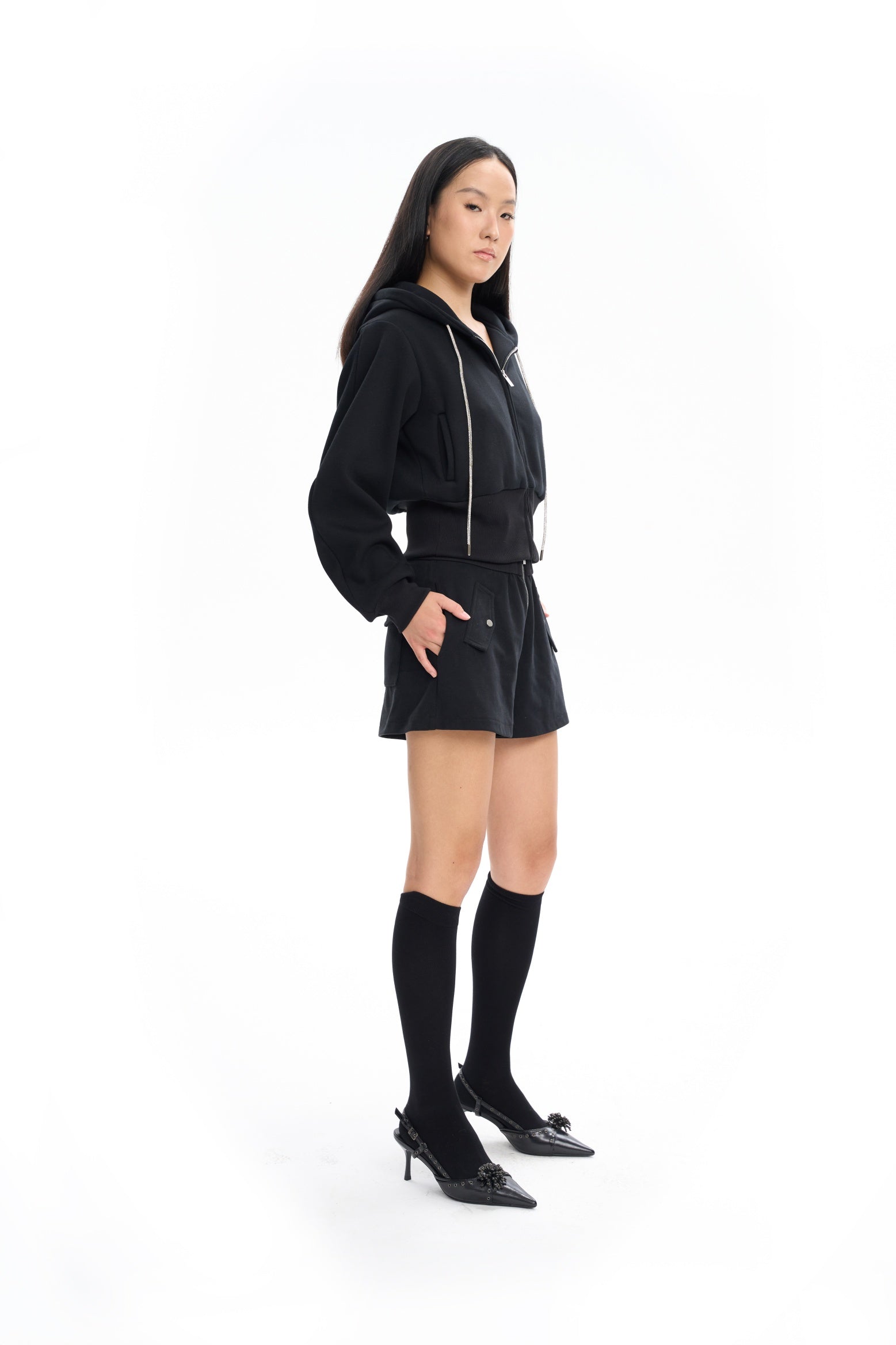 Cropped Hoodie with Rhinestone Drawstrings