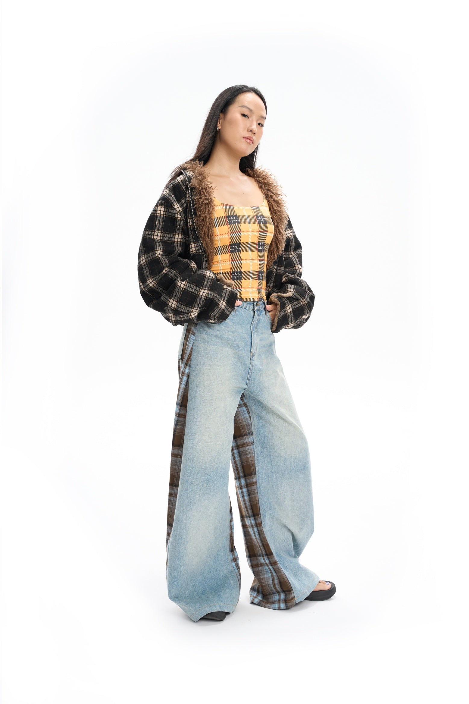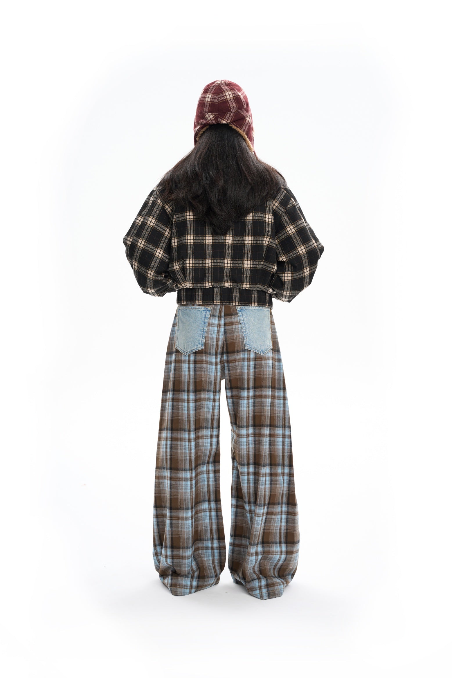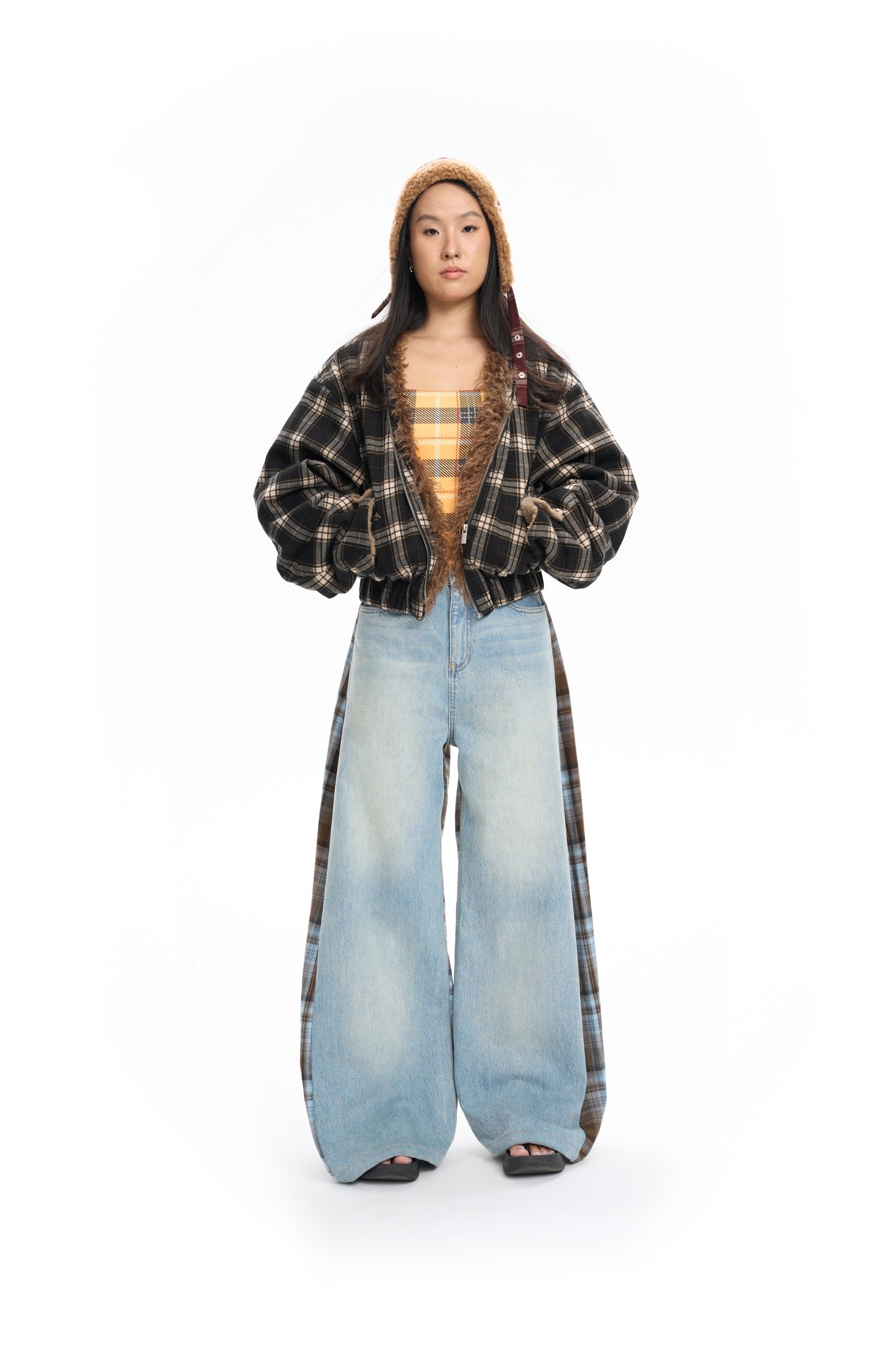 lnterior is made of faux lamb wool fabric,offering comfortable wear and a certain level of warmth.The checkered pattern adds a playful touch,and the overall silhouette is slightly cropped.