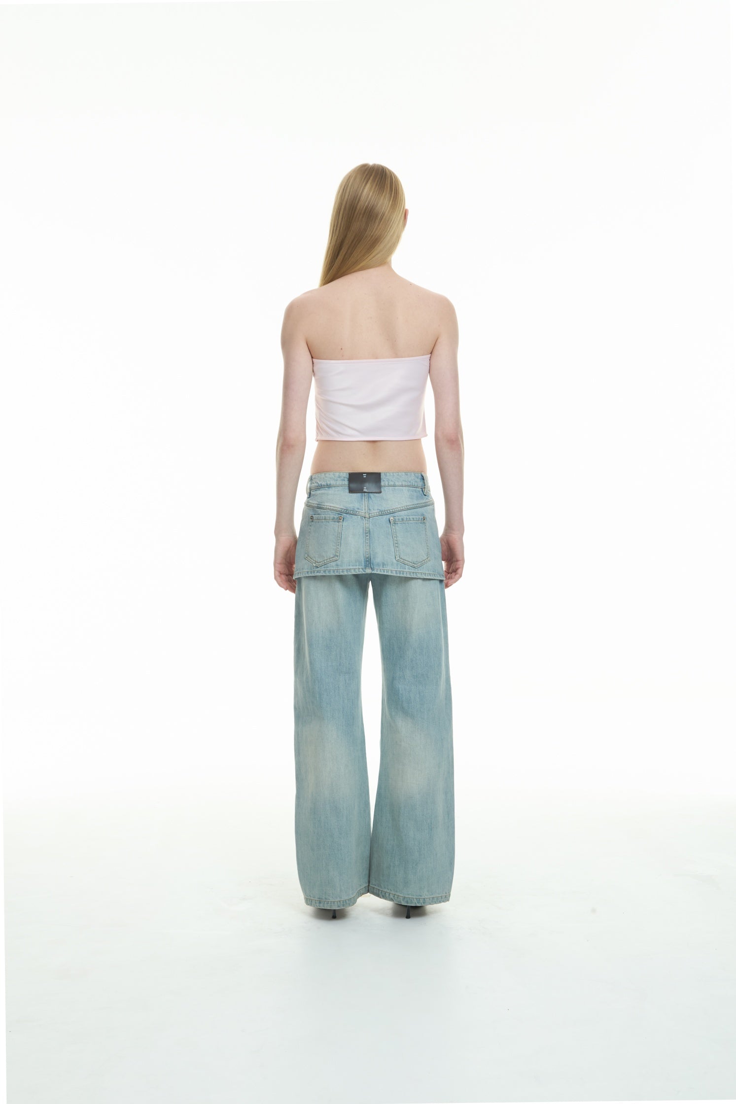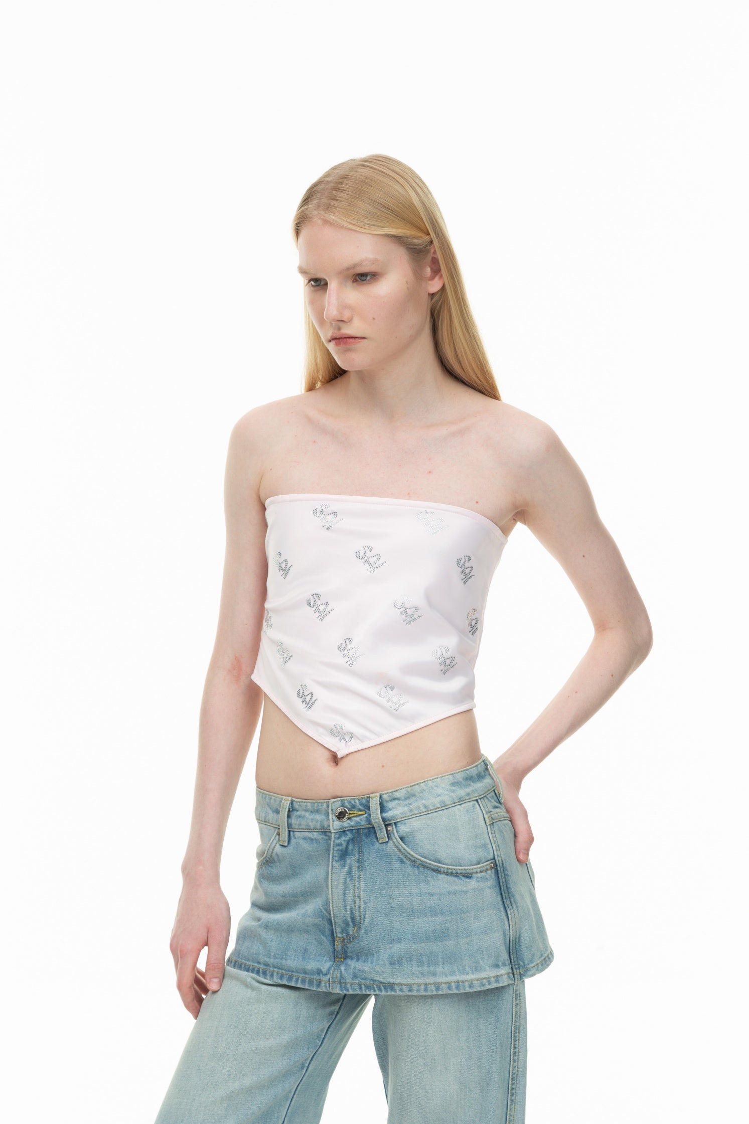 strapless and zipperless tube top in stretch satin with crystal hofix logo monogram.